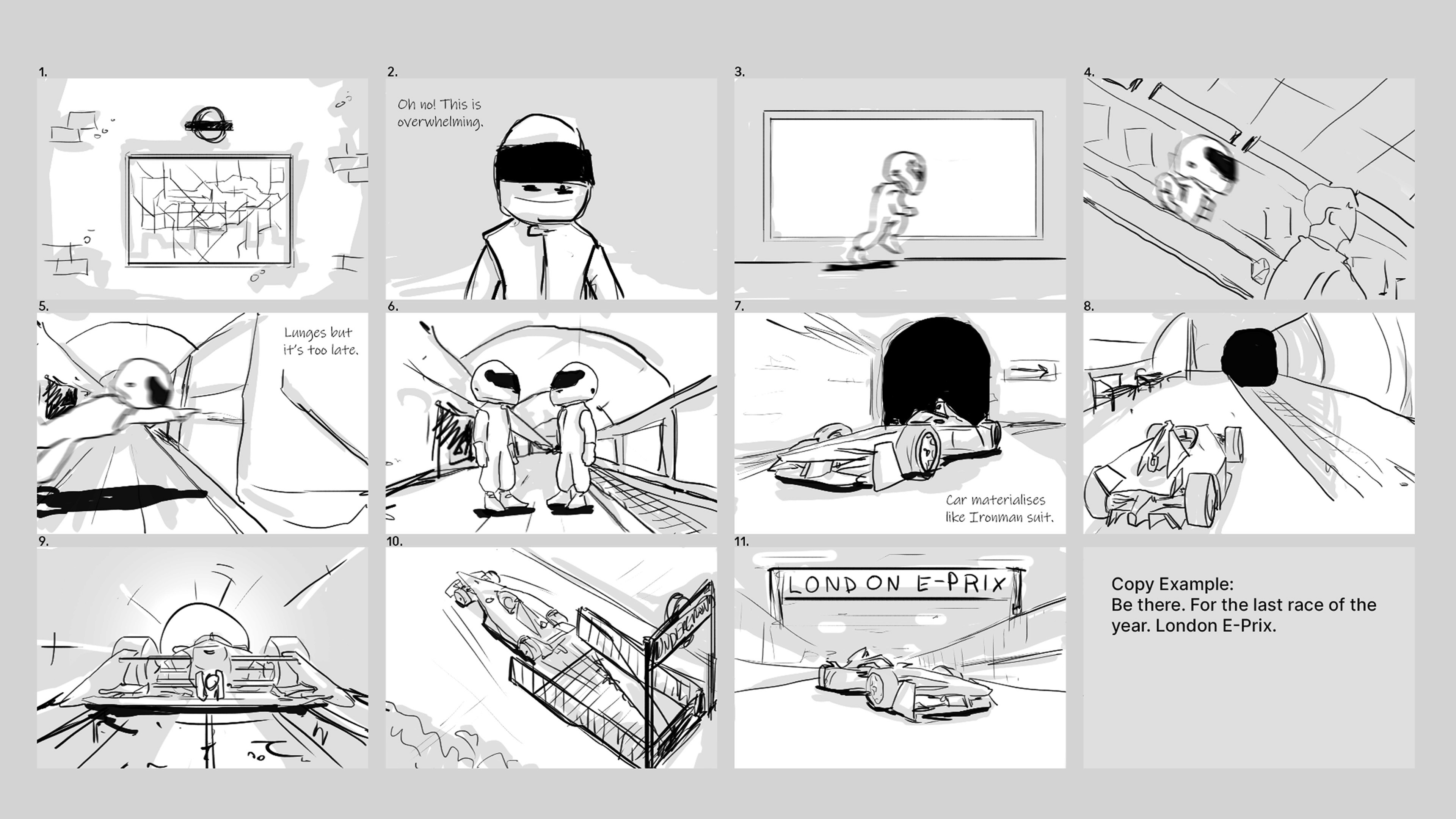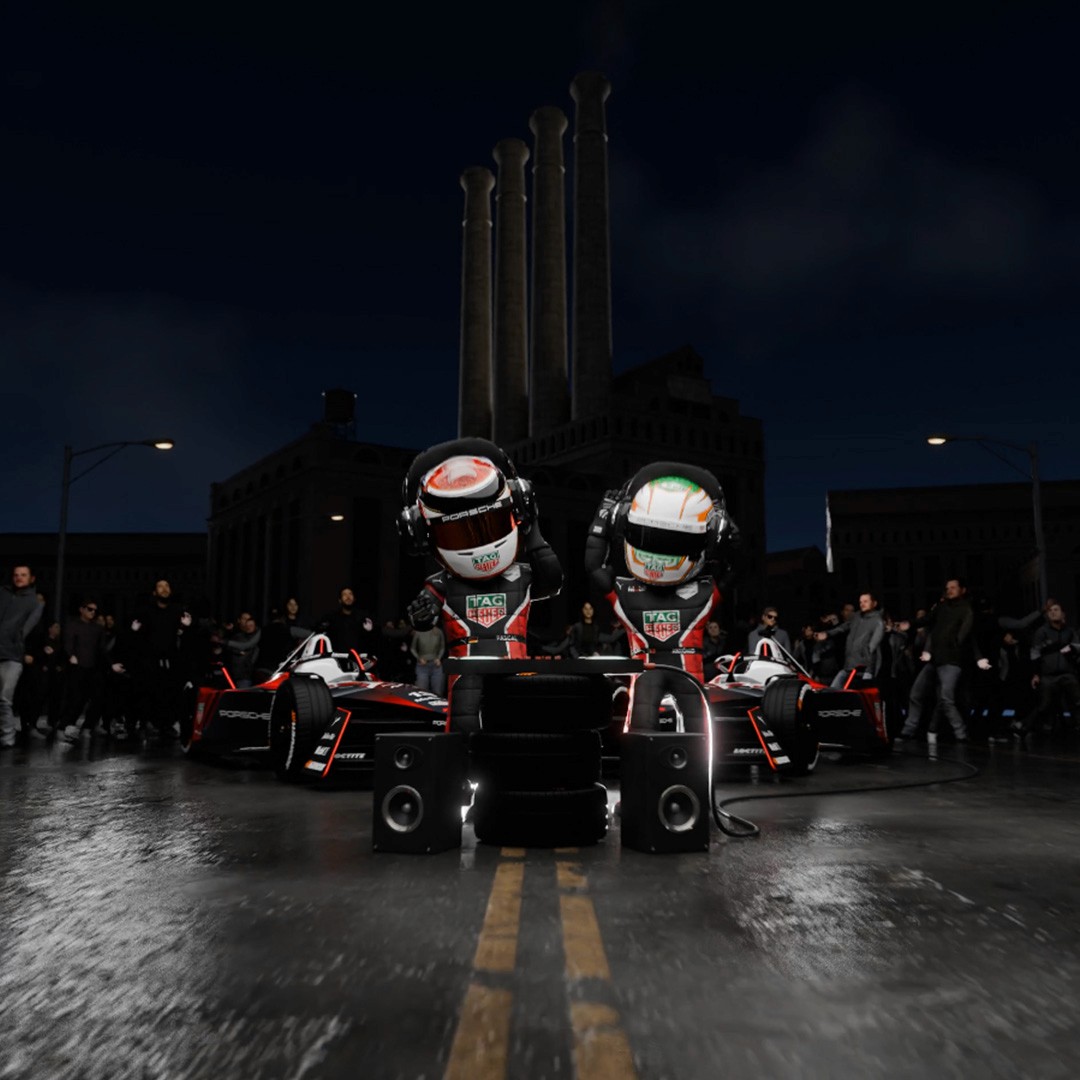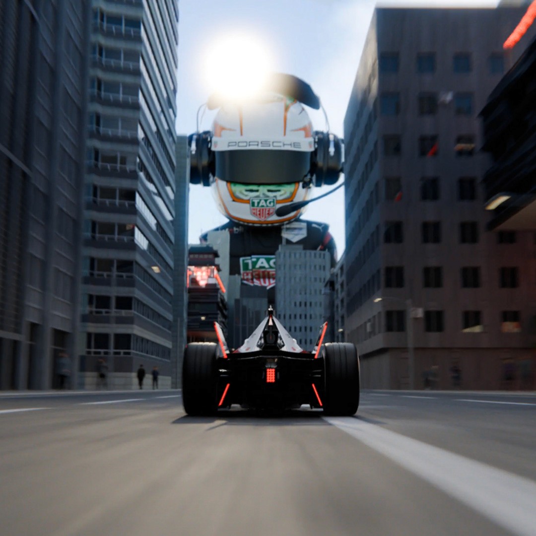 The genesis of this animation came through playing with scale and reversing the characters from being small and cute to giants, like Godzilla. The Tokyo E-Prix seemed like the perfect race for this, and finding product placement for a flex pod was a bonus.